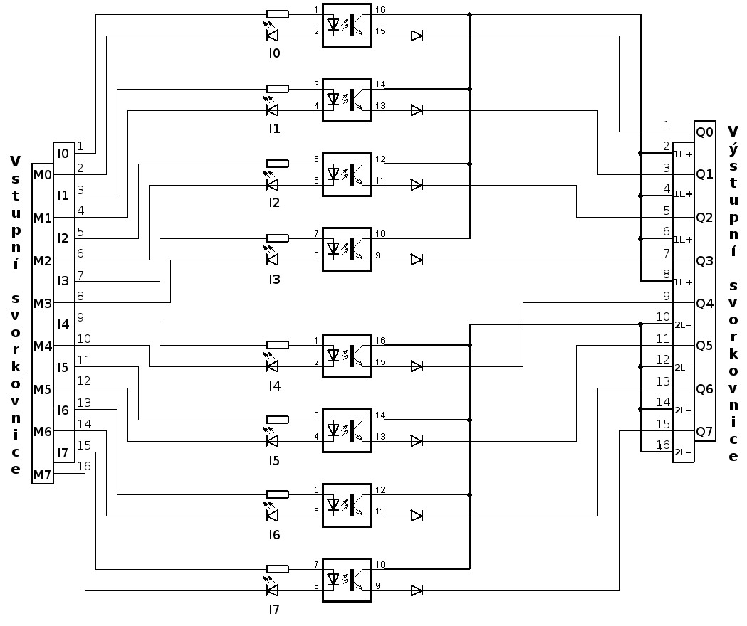 Eight channel optocoupler that is used for galvanic separation signals for input to PLC. It's for use anywhere that ground loops, connection circuits SELV & PELV and any other problems that can occur with the connection of electrically incompatible devices. The optocoupler is designed for industrial environment. For easy installation to the switchboard, there is a 35 mm DIN rail system equipped. To connect the wires, a massive two-storey terminal block is used. The advantage of the optocoupler is that it requires no external power supply for its operation. Every input is equipped with a green LED to signal the activity of the input. Every quadrant of outputs has a common power supply-clamp, L+.